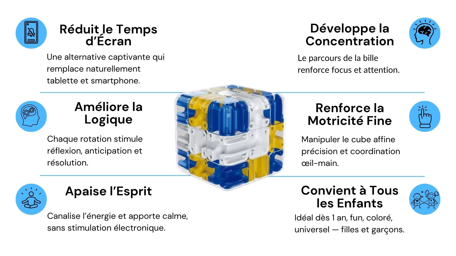 "Incroyable pour canaliser les émotions. Quand mon fils sent la colère monter ou qu'il est frustré, il prend son cube. Le fait de devoir se concentrer sur la bille l'oblige à calmer sa respiration et ses gestes. C'est devenu son outil de retour au calme, bien plus efficace que de l'isoler dans sa chambre."